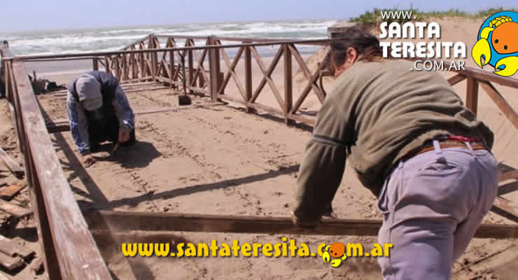 Luego de los reiterados fenómenos meteorológicos, la pasarela de Santa Teresita y algunas bajadas quedaron descalzadas. El equipo de carpintería está trabajando para solucionar el problema y en poco tiempo estarán instaladas las extensiones para recuperar la funcionalidad antes del comienzo de la temporada veraniega.